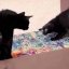子ネコが椅子の上にいた。そこから私を狙っている。てやぁ!→子猫、一撃離脱です…